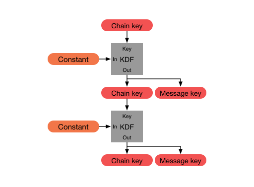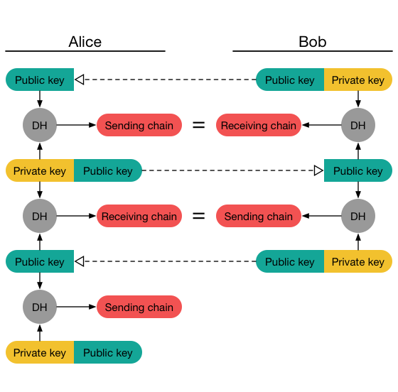 The Diffie-Hellman ratchet incorporates a new ECDH public key into each message sent. Using Alice and Bob, the fictional characters often referred to when explaining asymmetric encryption, when Alice sends Bob a message, she creates a new ratchet keypair and computes the ECDH agreement between this key and the last ratchet public key Bob sent. This gives her a new secret, and she knows that once Bob gets her new public key, he will know this secret, too (because, as mentioned earlier, Bob previously sent that other key). With that, Alice can mix the new secret with her old root key to get a new root key and start fresh. The result: Attackers who learn her old secrets won’t be able to tell the difference between her new ratchet keys and random noise.