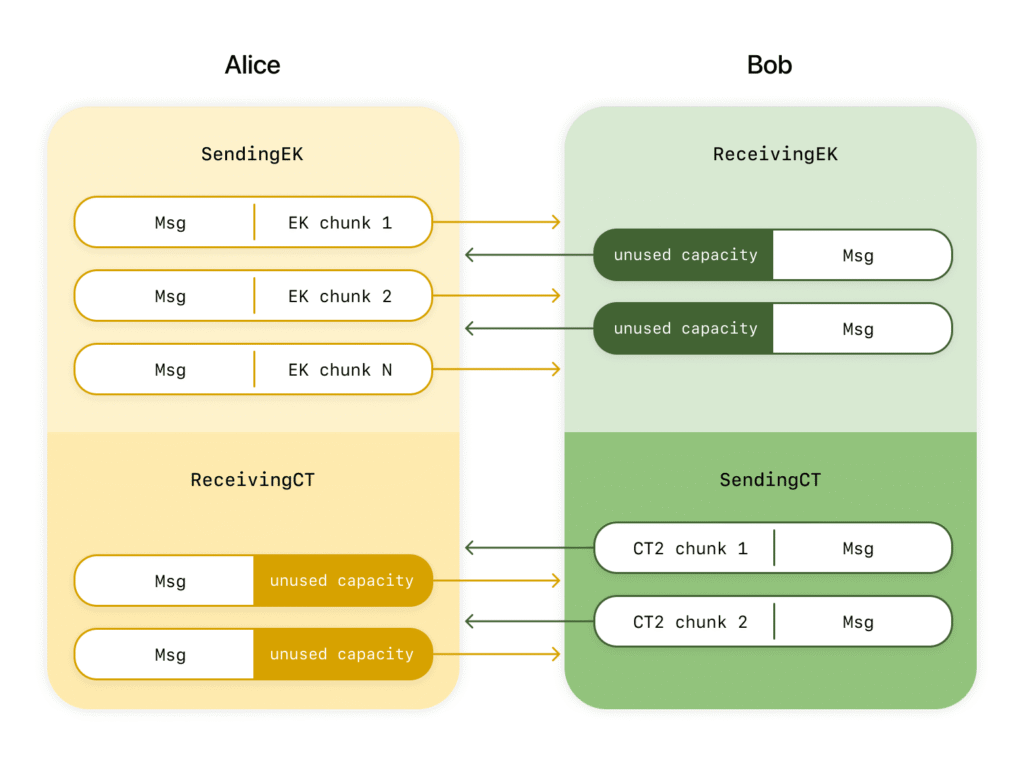 The technical challenges were anything but easy. Elliptic curve keys generated in the X25519 implementation are about 32 bytes long, small enough to be added to each message without creating a burden on already constrained bandwidths or computing resources. A ML-KEM 768 key, by contrast, is 1,000 bytes. Additionally, Signal’s design requires sending both an encryption key and a ciphertext, making the total size 2272 bytes.
